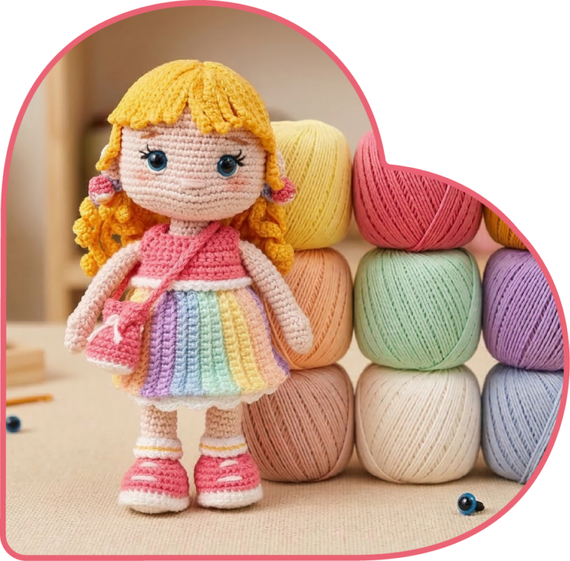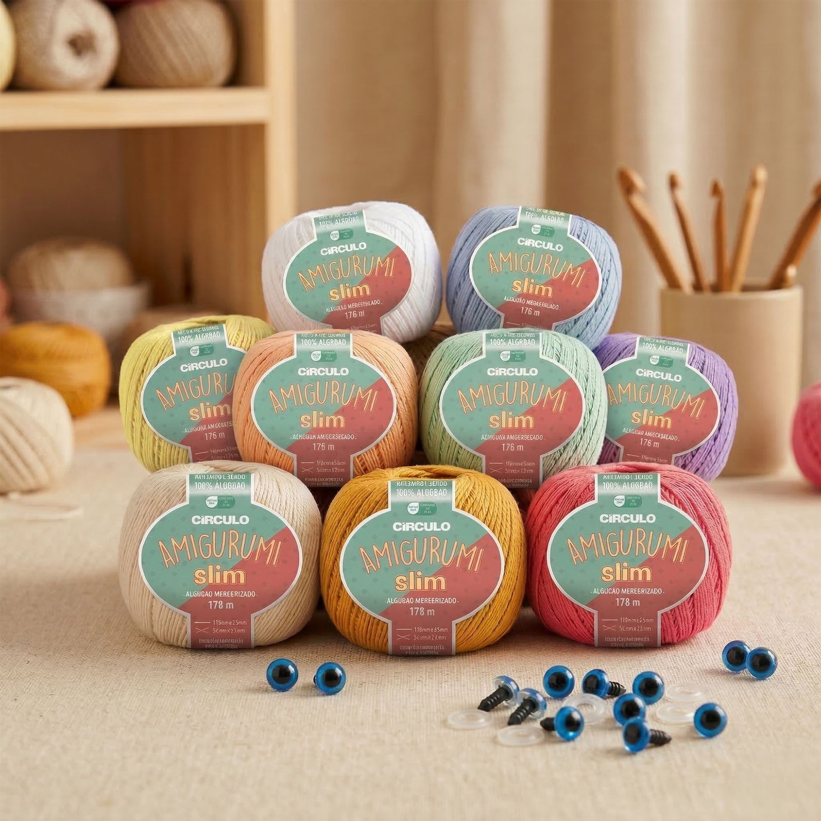 Tudo que você precisa para criar a Boneca Jubs do zero: 9 cores da linha Amigurumi Slim da Círculo, selecionadas a dedo pela DUAMÔ para o projeto. Combinação testada. Só chegar no encontro e criar.